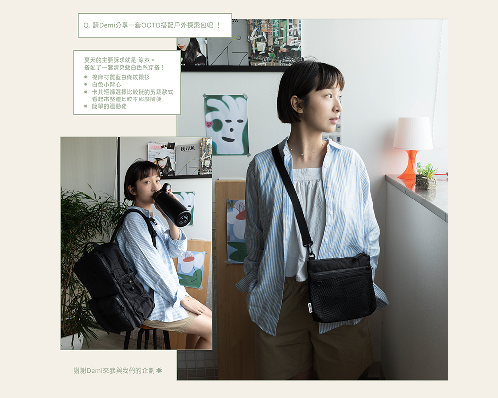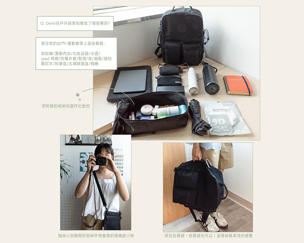 戶外探索包三色都是基本色系,在搭配上困難度不高,像Demi這樣穿著比較低彩度的衣服,搭配比較有份量感、酷酷的黑色戶外探索包,就多了一份個性感。